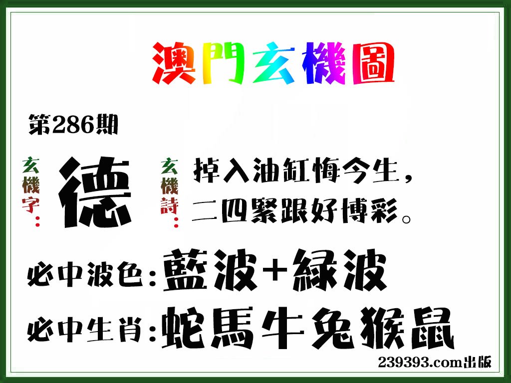 286期必中③肖: 牛虎兔 |