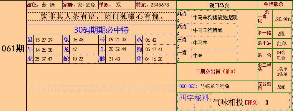 060期必中⑤肖: 猪鸡马鼠猴 |